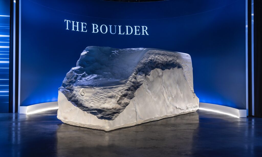 Mercedes-Benz ha revelado las primeras claves estéticas mediante una escultura en piedra apodada ‘The Boulder’ (6,50 m de largo, 2,75 m de ancho y 2,50 m de alto). En ese bloque se intuyen varios elementos de la próxima Sprinter como una parrilla de mayor presencia, un capó largo y bajo y un volumen de carga más cuadrado, con un enfoque funcional y robusto.