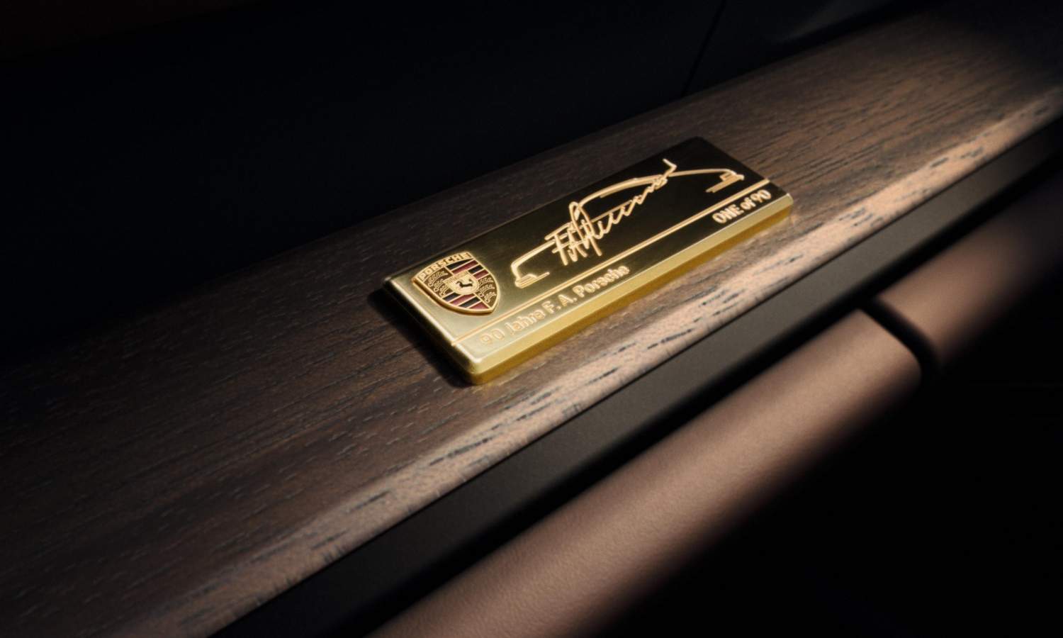 Cada unidad está identificada como pieza de colección mediante una placa chapada en oro situada en el salpicadero, donde figura la silueta del 911 original, la reproducción de la firma de Ferdinand Alexander y la inscripción “One of 90”. El compartimento portaobjetos de la consola central también incorpora un grabado que reproduce el motivo del emblema exterior del 90 aniversario, reforzando la coherencia entre el diseño exterior e interior.
