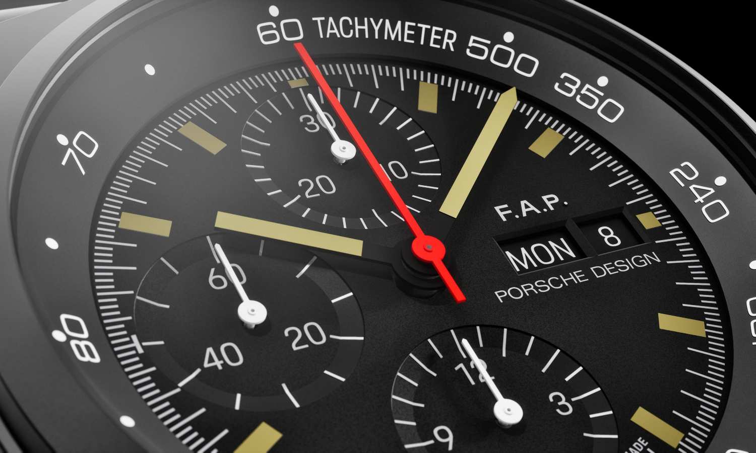 Cada comprador del 911 GT3 90 F. A. Porsche recibe además un Chronograph 1 de Porsche Design fabricado en exclusiva para esta serie. Este reloj de pulsera retoma el diseño del Chronograph 1 – 1972 Limited Edition, pero añade detalles específicos: un material luminiscente Super-LumiNova con efecto pátina que evoca el envejecimiento del radio o el tritio, el histórico logotipo de Porsche Design en la corona y el cierre, y las iniciales de F. A. Porsche en la ventana de día y fecha, en el lugar donde normalmente se sitúa el logotipo de la firma.